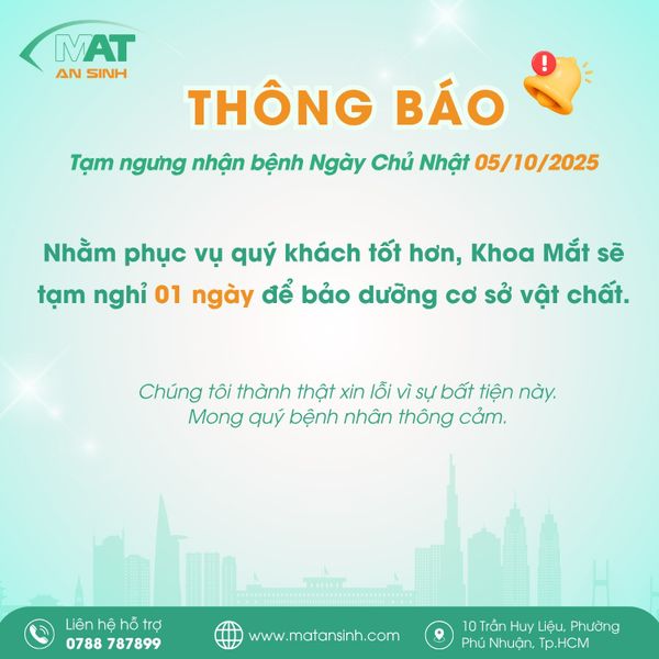 Với mong muốn không ngừng nâng cao chất lượng dịch vụ và mang đến trải nghiệm khám chữa bệnh tốt nhất, Khoa Mắt Kỹ thuật cao Bệnh viện An Sinh xin trân trọng thông báo về việc "tạm ngưng nhận bệnh" để tiến hành bảo dưỡng cơ sở vật chất.